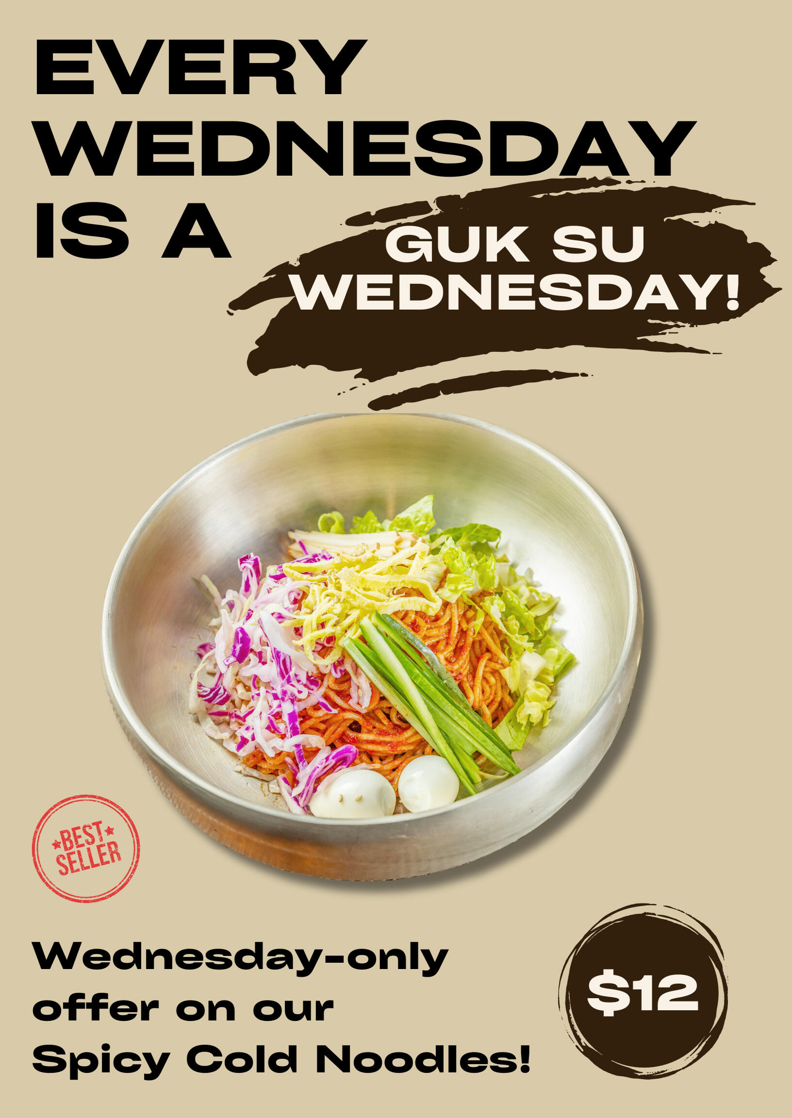 Don't miss out—come by on Wednesday and experience the kick of our Spicy Cold Noodles for just $12!Every Wednesday, treat yourself to our popular Spicy Cold Noodles (Bibim Naengmyun) for just $12! Guk Su Wednesday is your chance to enjoy this flavorful, refreshing dish at a special price—available only on Wednesdays.Our Spicy Cold Noodles are a perfect blend of chewy buckwheat noodles, vibrant vegetables, and our signature spicy sauce, all topped with fresh ingredients for an unforgettable taste. Whether you're a fan of bold flavors or just looking to try something new, Guk Su Wednesday is the perfect time to indulge.